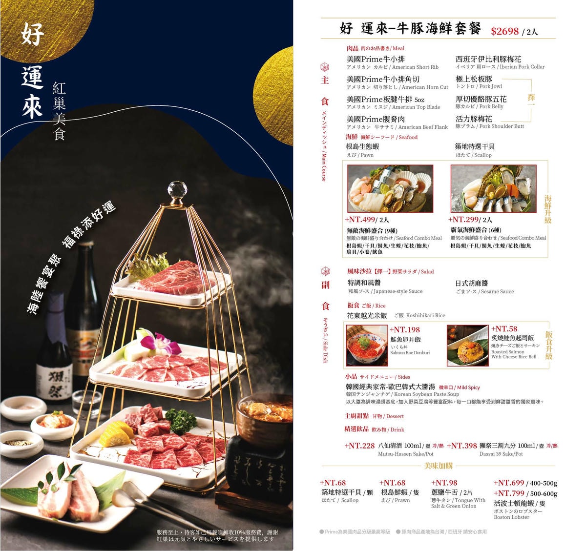 這天羽諾吃的是好運來牛豚海鮮雙人套餐 $2698元+10%服務費
