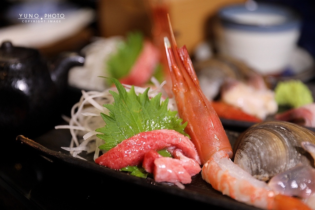內含加拿大牡丹蝦、青甘刺身、日本北海道北寄貝、黑鮪魚大腹下方還有紫蘇葉可以包裹一起享用