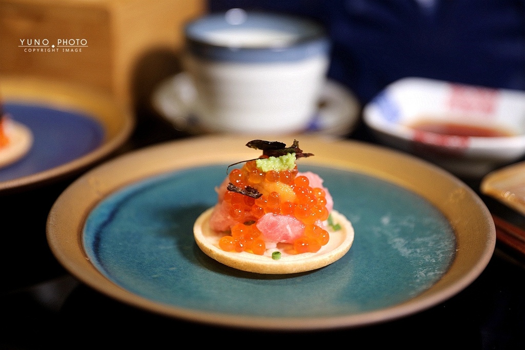 裡面有黑鮪魚肚肉、日本鮭魚卵、北海道馬糞海膽 底下再用果子餅皮盛裝
