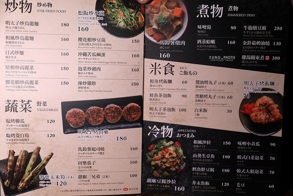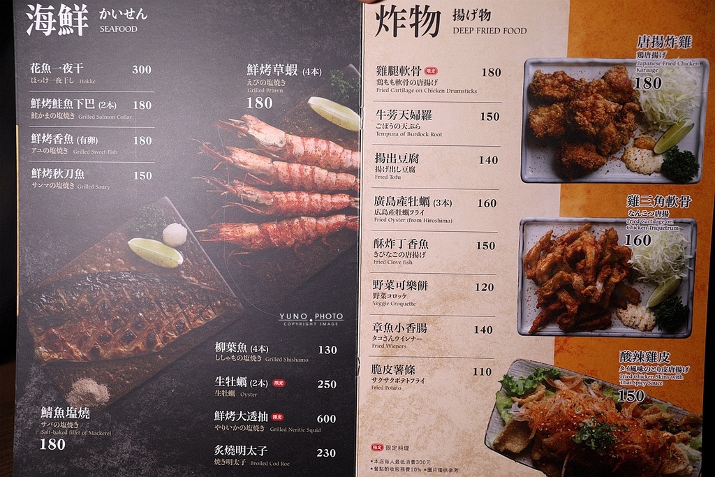 菜單上有很多下酒菜 像是炸物、串燒、海鮮、煮物、單品、米食、時蔬、麵類與啤酒跟清酒