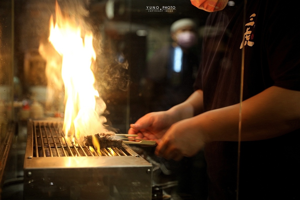 廚房烤檯師傅正在忙碌烤著串燒 手上一刻也不得閒 手腳俐落處理串燒烤物