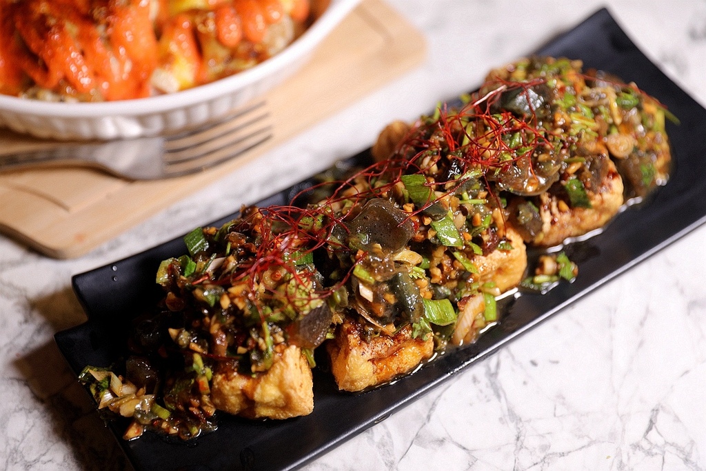 這道碳烤臭豆腐相當有創意 主廚加上蒜頭和辣椒及皮蛋調味