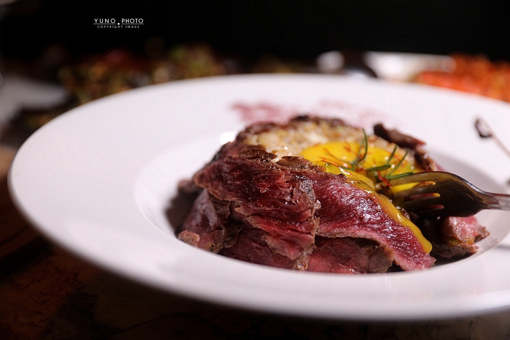 一旁的紅酒鹽可以搭配牛肉 飯中央是月見生蛋黃 牛肉肉質鮮嫩柔美 再把蛋液戳破混著炒飯