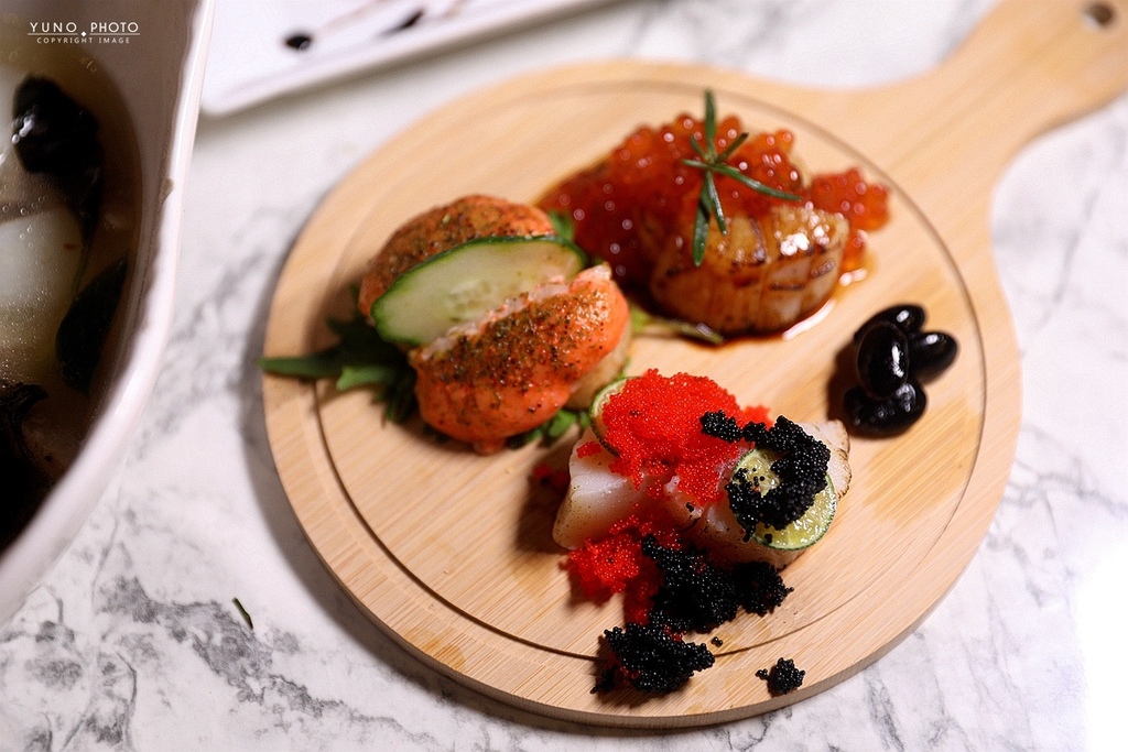 分別為鮭魚卵、蝦卵魚子醬及明太子醬 三種口味 主廚使用生命之水