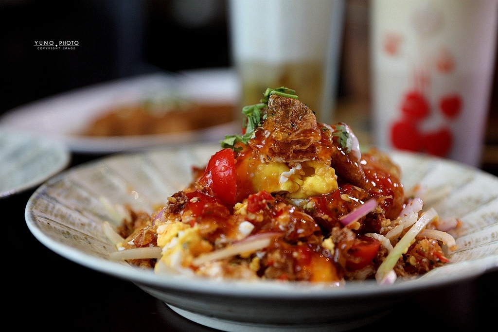 炸的酥酥的荷包蛋加上洋蔥、番茄 在淋上泰式醬汁