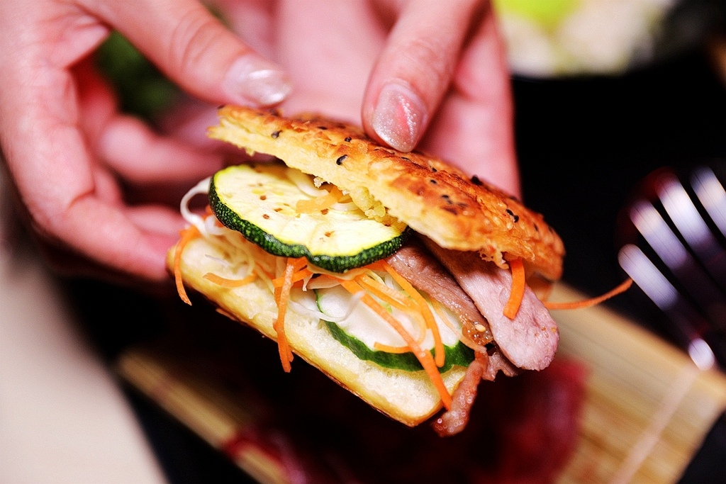 把烤好的燒肉及紅蘿蔔絲 時蔬夾進燒餅內一起吃 層次感更好