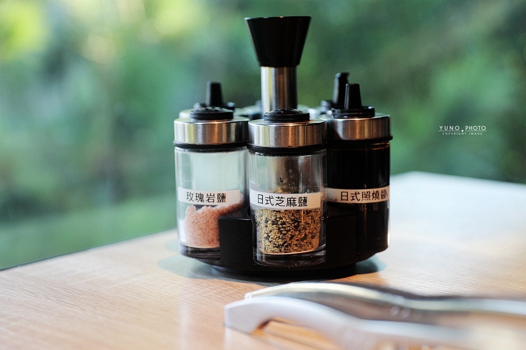 分別有日式芝麻鹽、新鮮檸檬汁、秘製燒肉醬油、日式照燒醬、玫瑰岩鹽、紅巢椒鹽粉