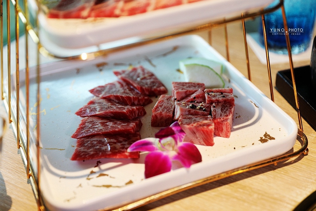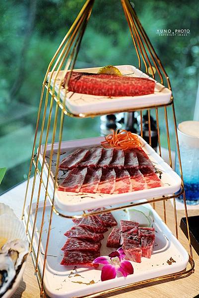 肉品是用是用下午茶三層架擺放 超有質感 而且也不會佔桌面空間