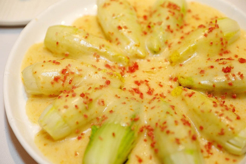 選用台灣的高品質娃娃菜 加上使用以鹹鴨蛋與鮮奶做成醬汁