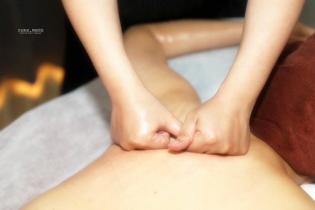 按摩師一開始紓緩的用雙手規律地將肌肉推開再放鬆、適度的力道按壓後 優先得到舒緩