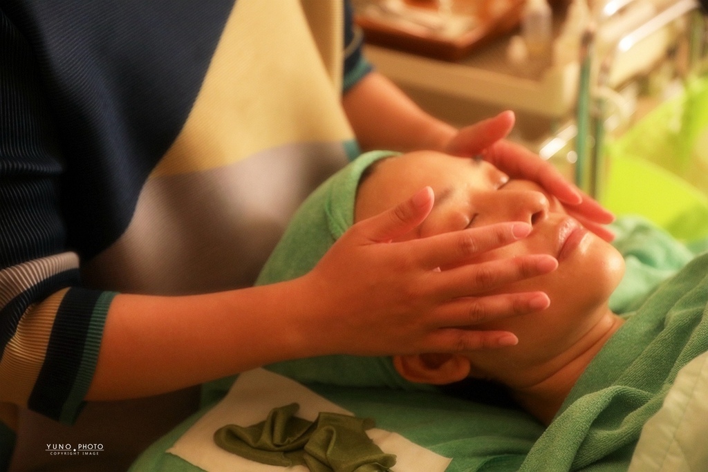 使用感溫棒滑撫、按壓等手技的運用於臉與肩頸及頭部