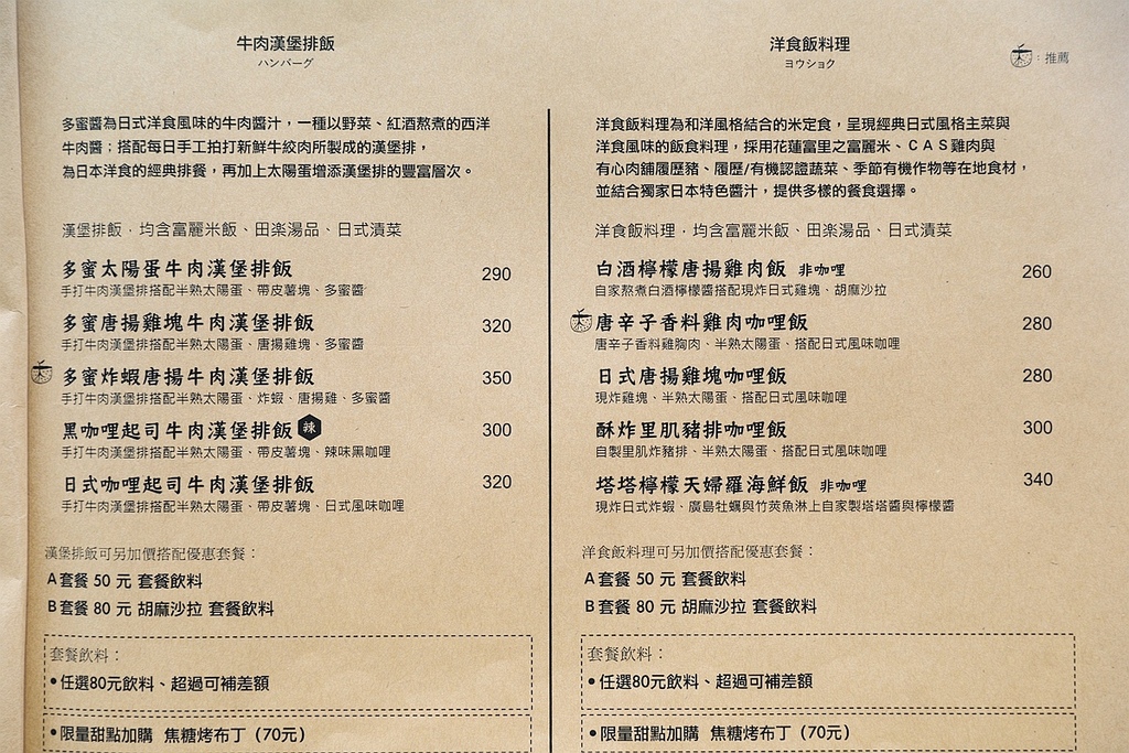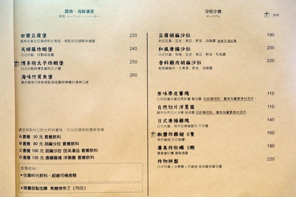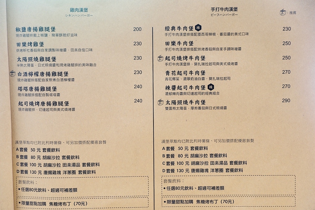 餐點選項很多 主打手作漢堡、牛肉漢堡排、洋食飯料理、沙拉小食、麵包朝午食