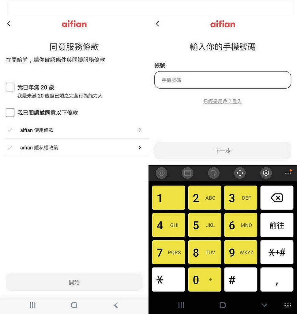 先將同意服務條款打勾、輸入手機號碼後並且設定密碼 註:目前僅開放年滿20歲的人哦!