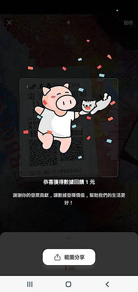 掃描發票後還會有可愛的小豬與小貓出來撒花 實在是太古錐嚕!