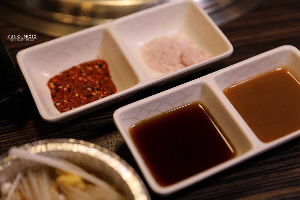 分別有日式水果醋、日式味增醬、玫瑰鹽、主廚燒醬、韓醬紅辣、香味蒜燒、七味粉
