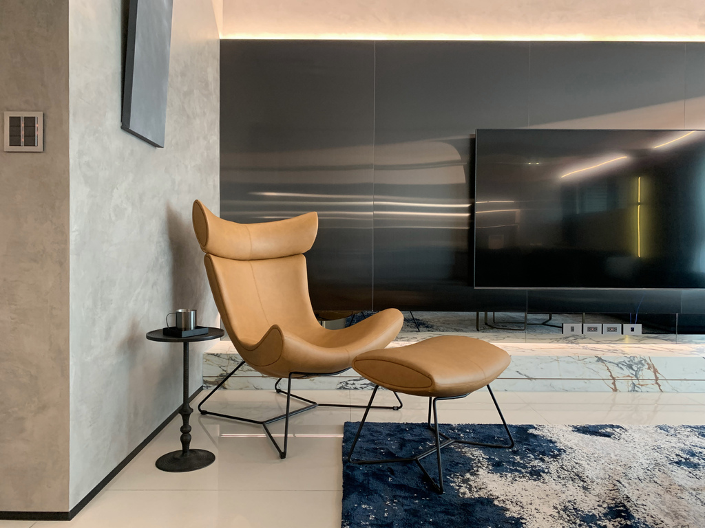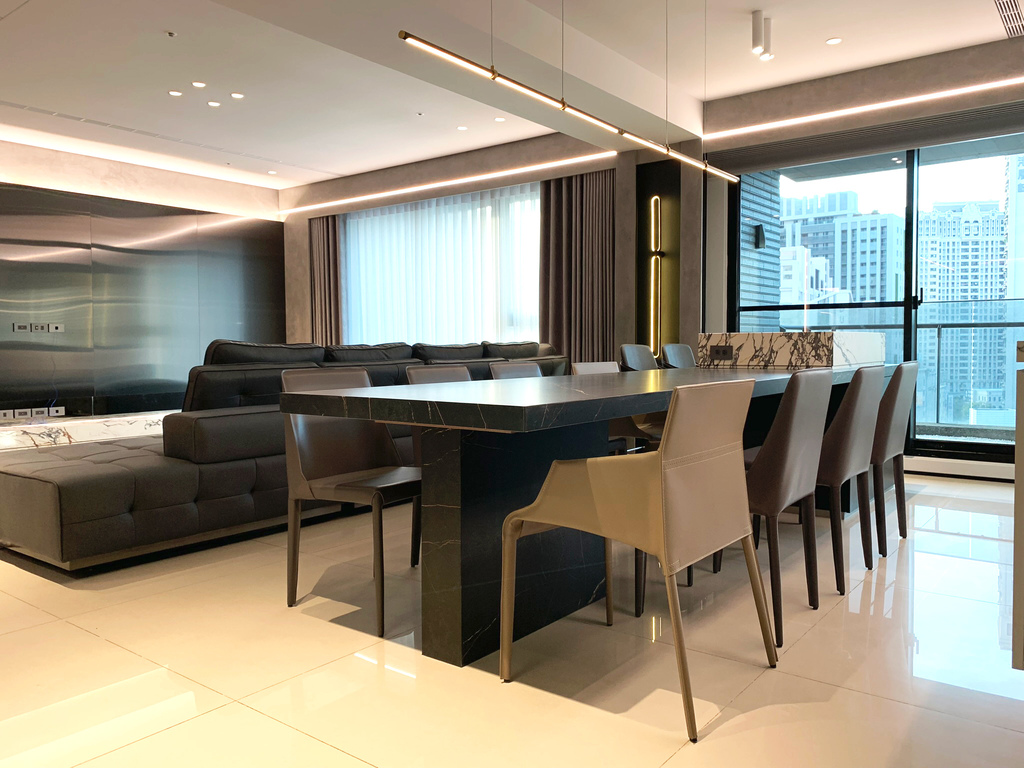 採用大量薄磚建構空間大面積。 搭配皮感的都會風格,體現了現代美學