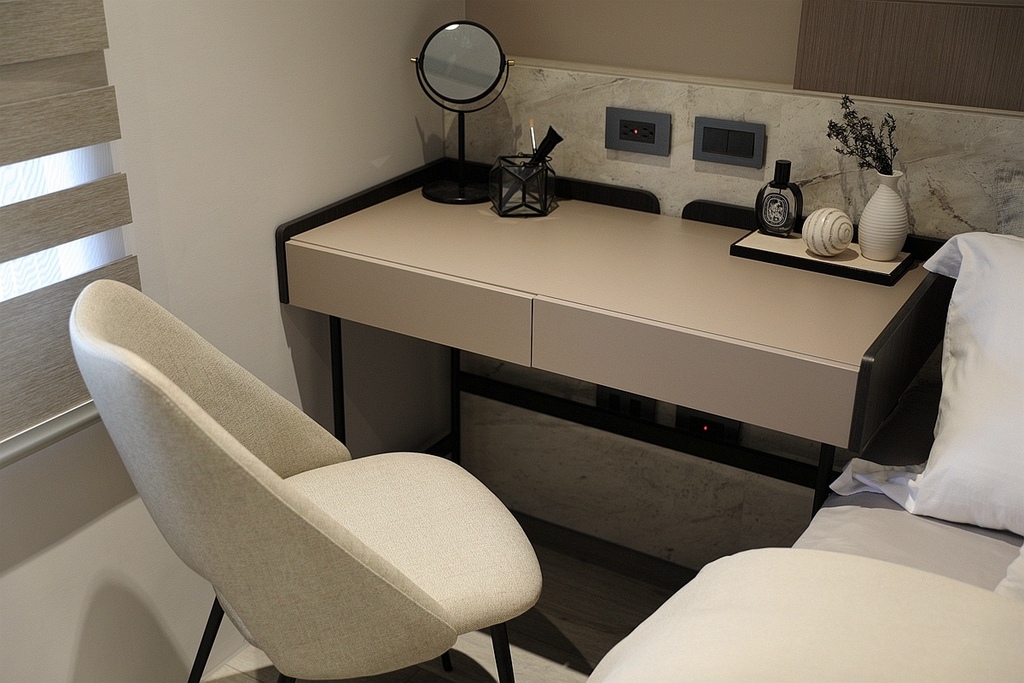 像是客房參考:乙作設計提供的3D效果圖化妝書椅/床台/床頭櫃搭配得相當優雅