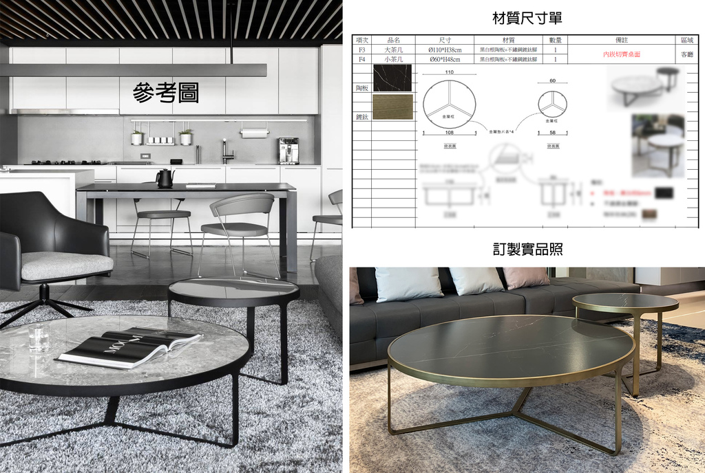 依照居家風格/3D圖面,提供各種參考圖片讓客戶選擇 程序:從 家具配案>預估材質>報價