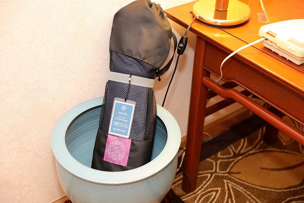 一旁還附瑜珈墊 可以出外的住客 可以在房間內運動舒筋