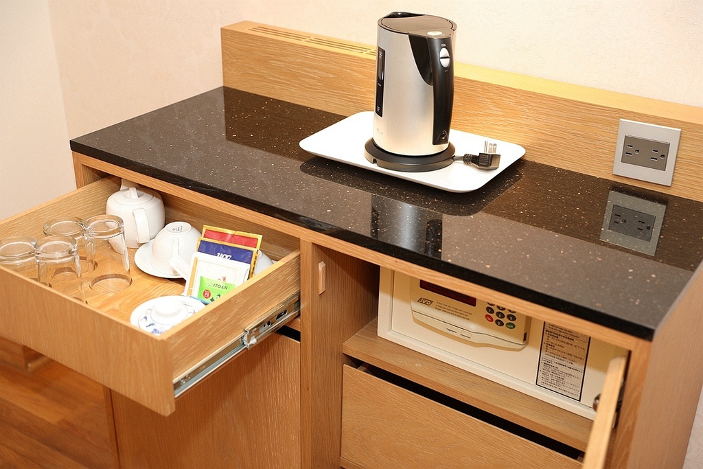 房內提供礦泉水以及電熱水壺、濾掛式咖啡、茶包