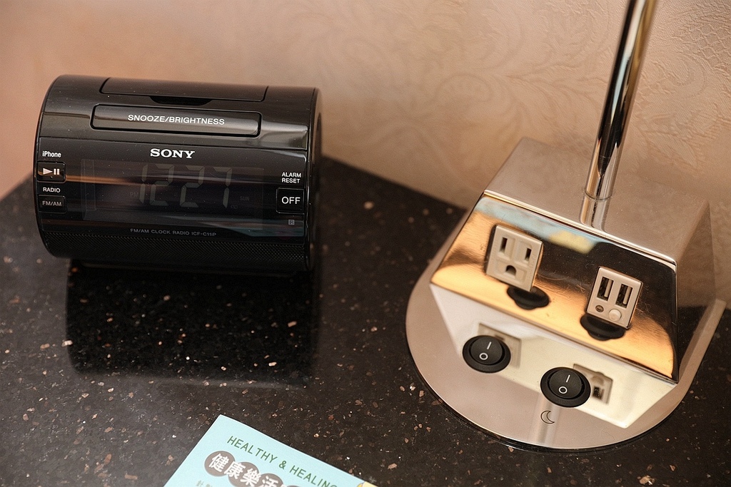 床頭邊放置著一台Sony鬧鐘兼播放器