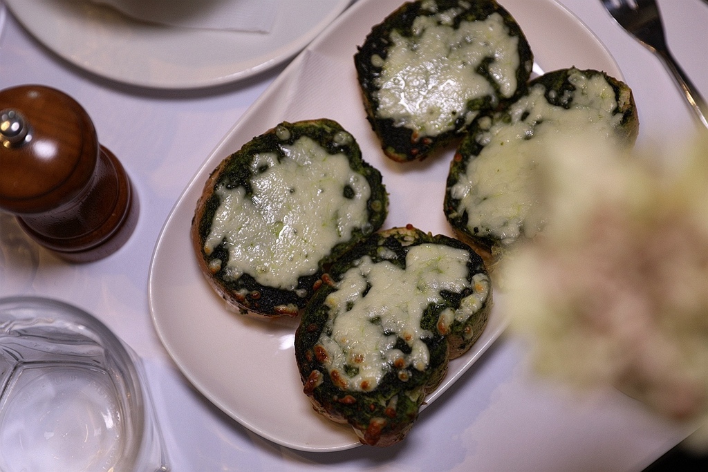 歐式麵包抹上濃郁的青醬 再加上起司焗烤