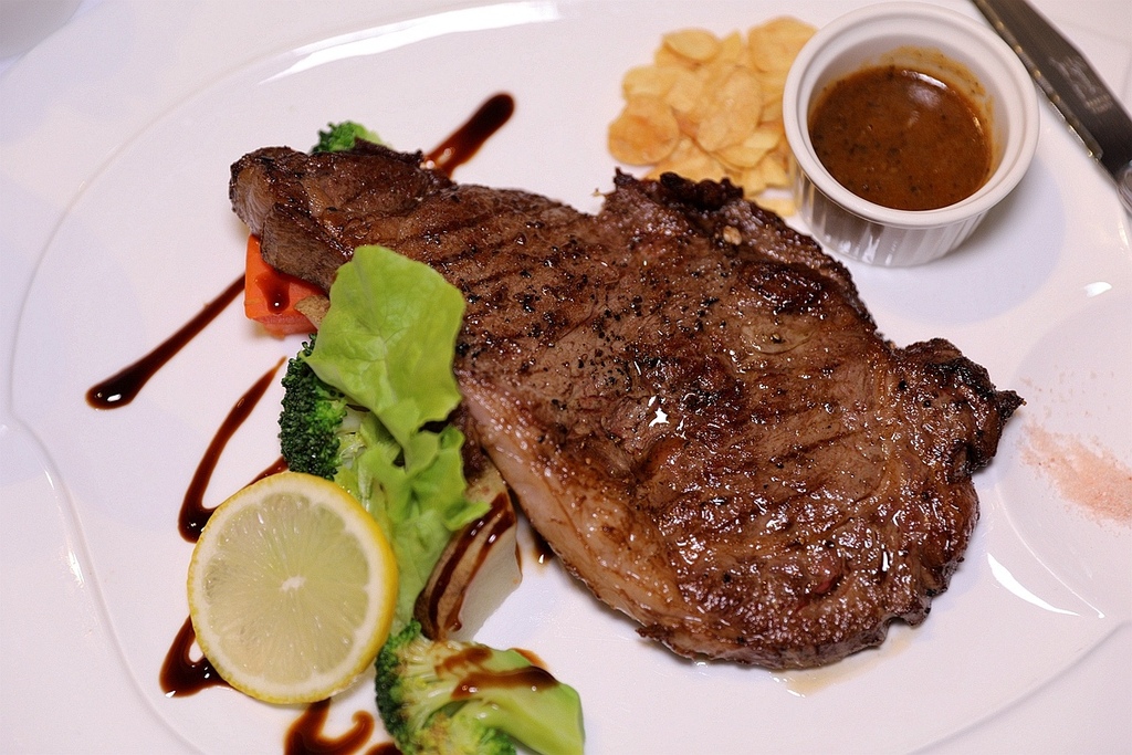 邊喝著紅酒、聽著悅耳的音樂、餐廳充滿了百合花香、吃著美味肋眼牛排