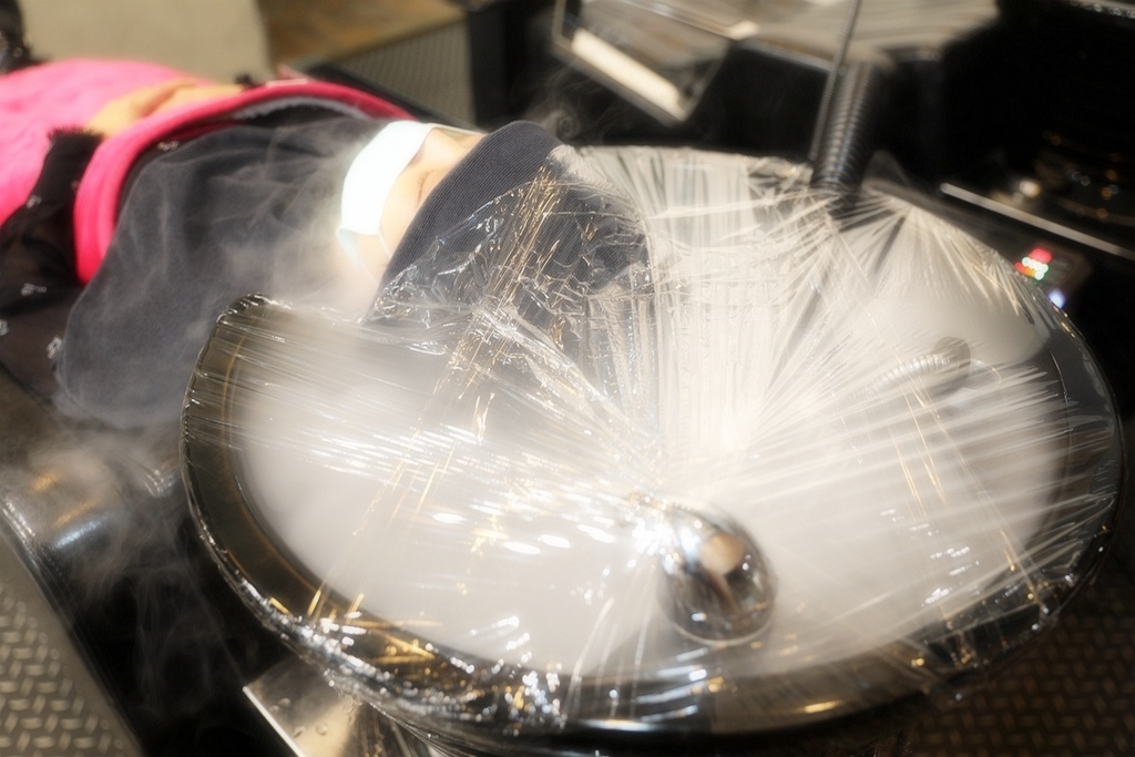 再使用微噴霧機去針對染燙髮做補水的動作