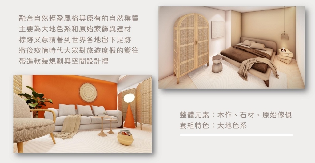 大地棕跡走的是度假風格 以大地色系為主搭配上原始家飾 具備自由靈魂的風格