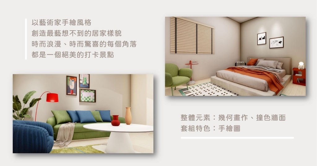 創意繪飾以三個主色串連 加上幾何畫作 撞色牆面 具設計感物件手繪圖飾具有濃濃的創造風格