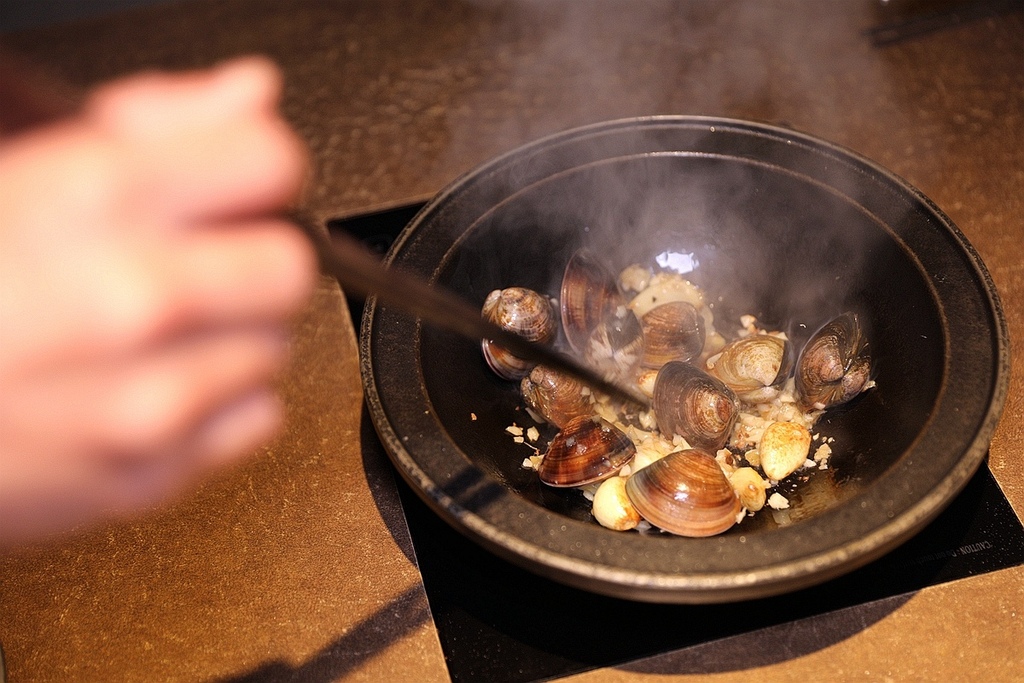 接著加入新鮮大蛤蜊 再加入高湯 光是聞到撲鼻而來的香氣就令人著迷不已