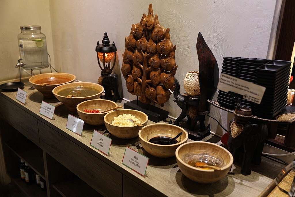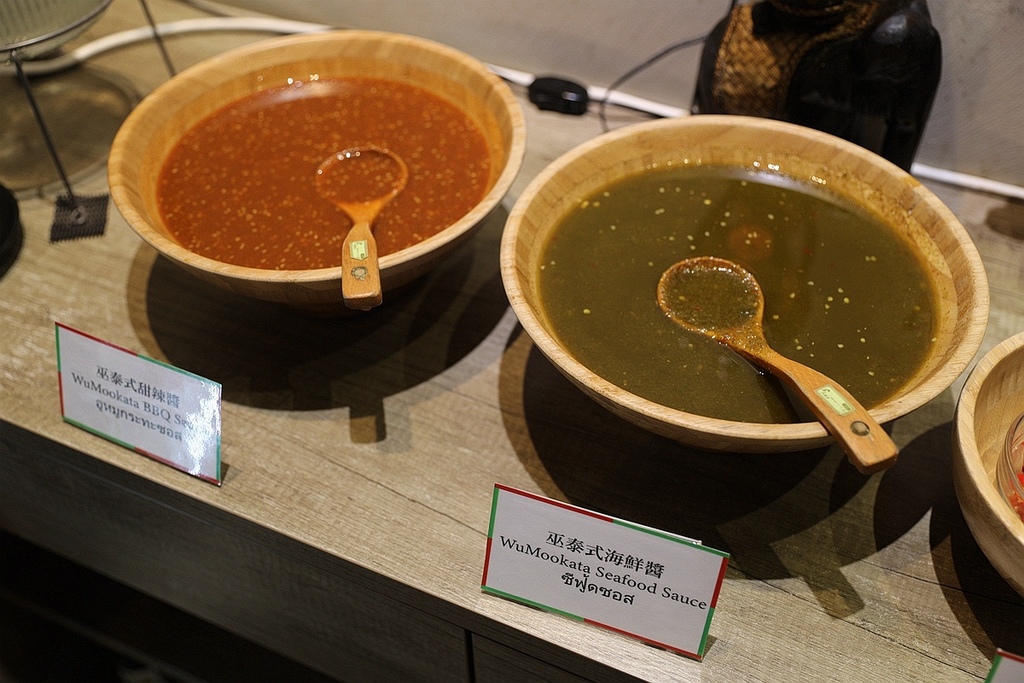 醬料區有巫泰式甜辣醬、巫泰式海鮮醬、蒜末、辣椒、甜梅醬及醬油