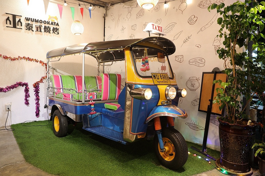 店門口擺放著一台真實版的泰國當地的嘟嘟車 顏色繽紛新穎 超適合拍照打卡