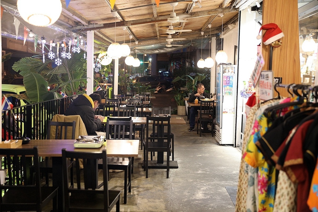 使用濃厚的泰國元素 運用許多綠色植栽、藤球吊燈、泰國歌曲、泰文招牌…等