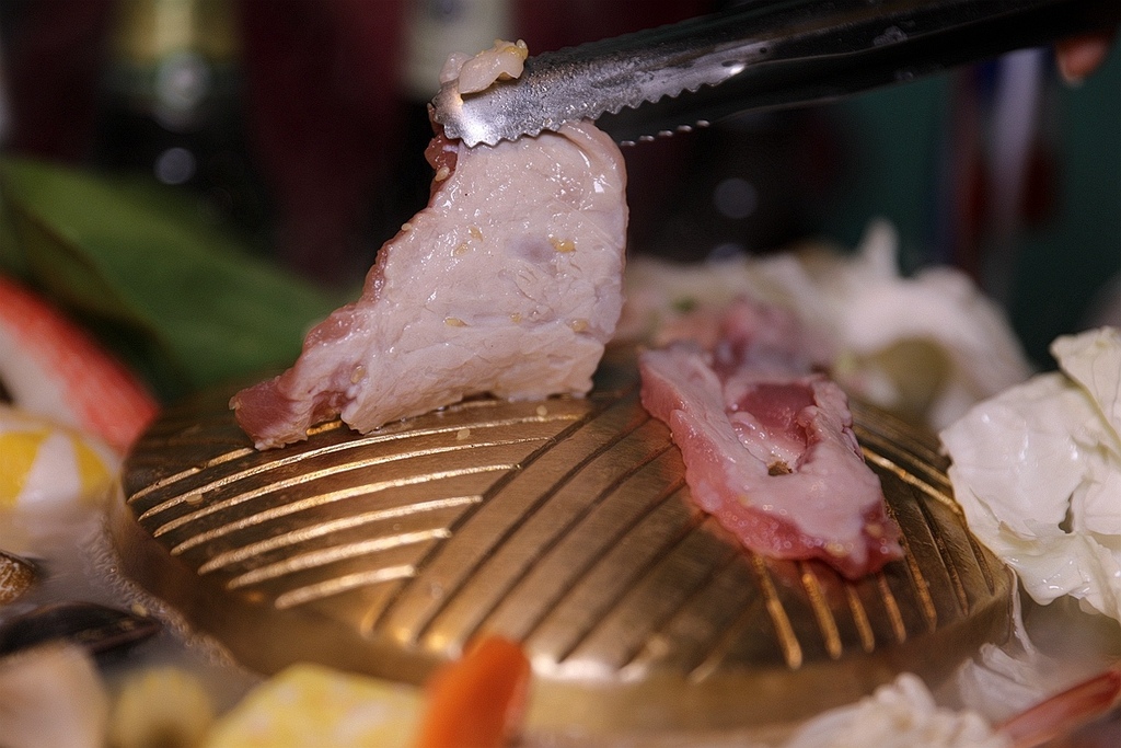 開烤前需先塗上豬油 肉品比較不容易黏住盤面 銅盤熱傳導相當快速 只需要簡單烤幾下就熟透了