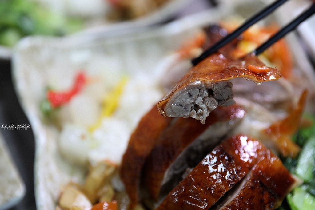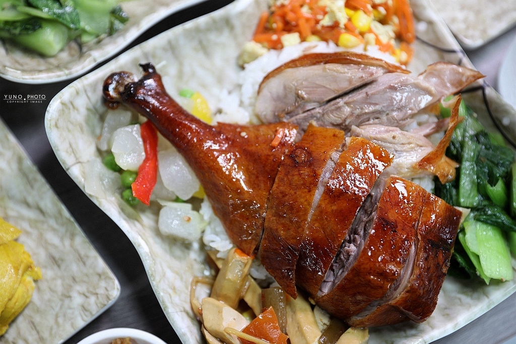 肉肉控必點 燒鴨外皮呈現焦糖色 油亮光澤包覆著鴨肉 肉質香而不柴