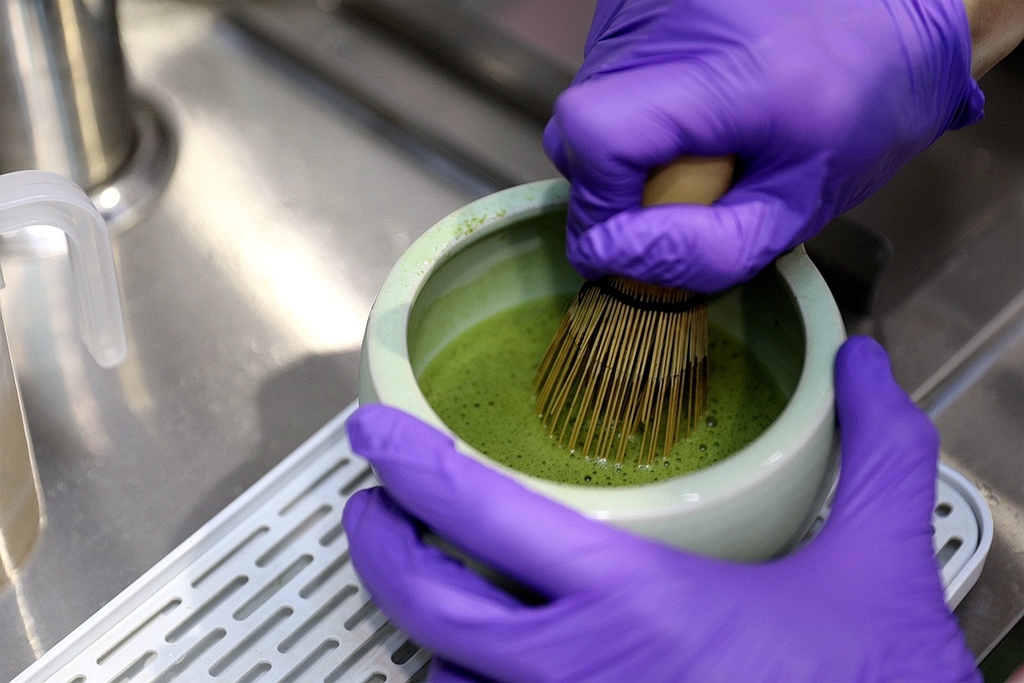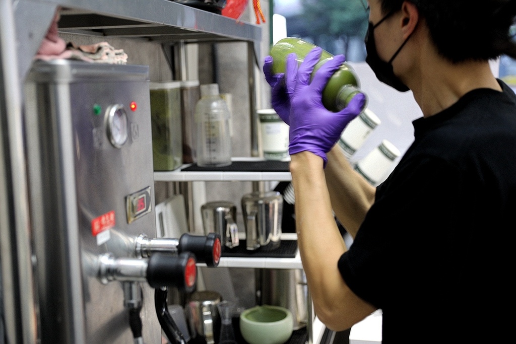 先用竹製抹茶刷茶打到起泡讓茶香更甚 再加入鮮奶雪克 細細品嚐 還能喝到抹茶迷人的甘苦味