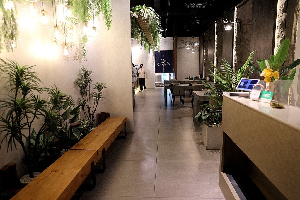 白色系外觀加上燙金森饗字樣 寬敞挑高的室內空間 仿真石牆相當有質感搭配綠植佈置