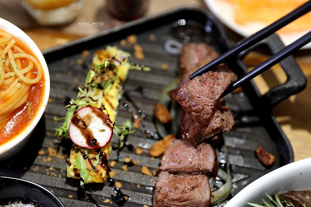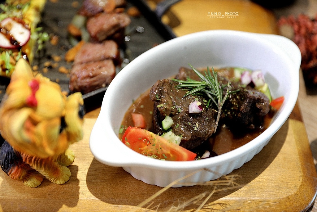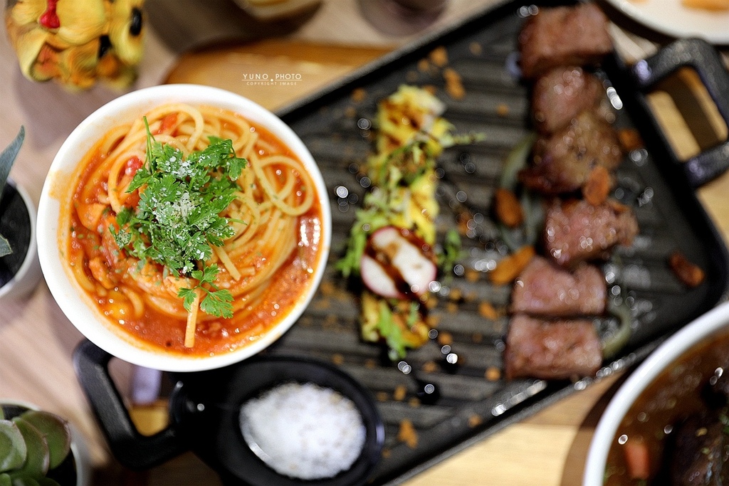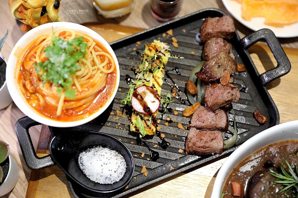 當天我們品嚐到了 燉牛頰&乾煎板腱菲力雙拼鐵板麵、芋泥肉鬆巧巴達堡、冰淇淋提拉米蘇、柳橙莓果...等