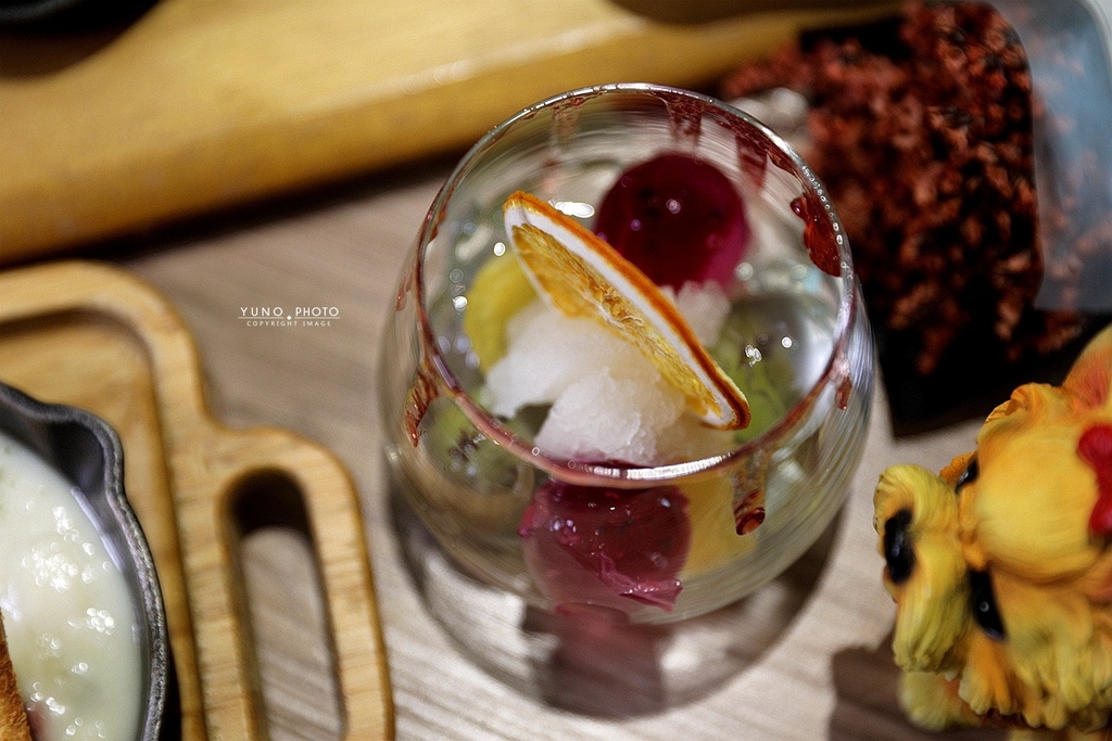 主廚使用了藍甘菊和接骨木做成的手作果凍 一顆一顆的晶球果凍 帶有咕溜Q彈口感
