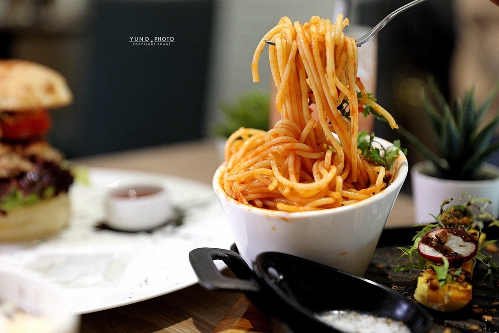 鐵板義大利麵使用番茄紅醬 麵條彈牙 鮮美甘甜 吃完超有飽足感