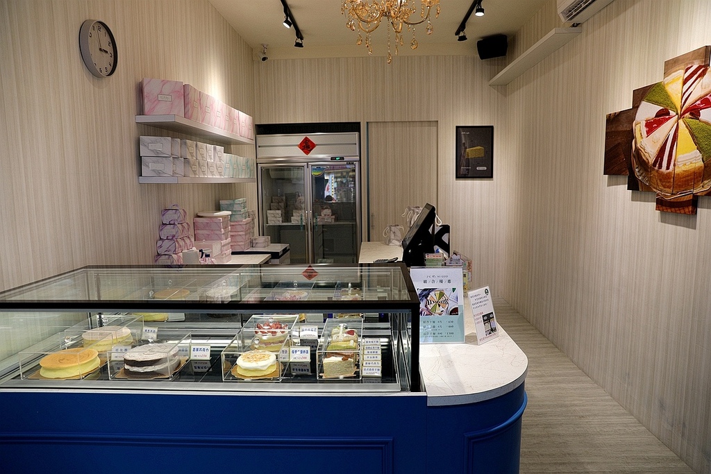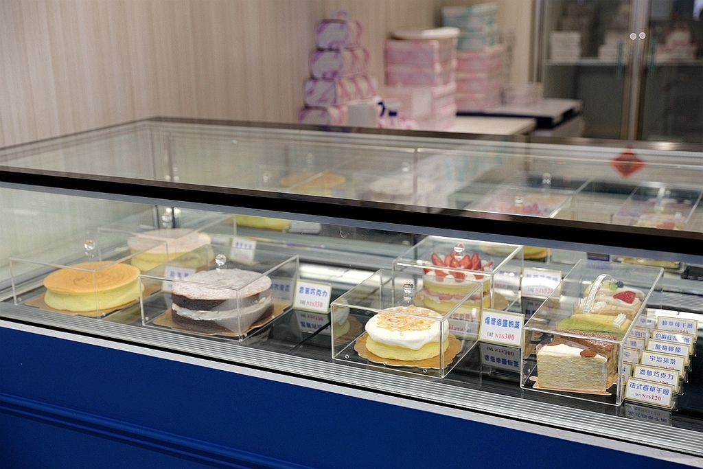 玻璃櫃內擺放著許多口味的千層蛋糕以及彌月蛋糕 戚風蛋糕