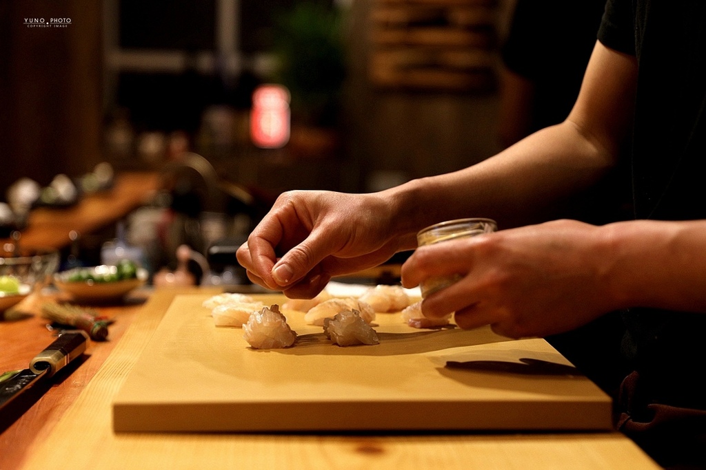 看著師傅在料理台上料理各類生鮮食材 展現日式料理的精髓技藝