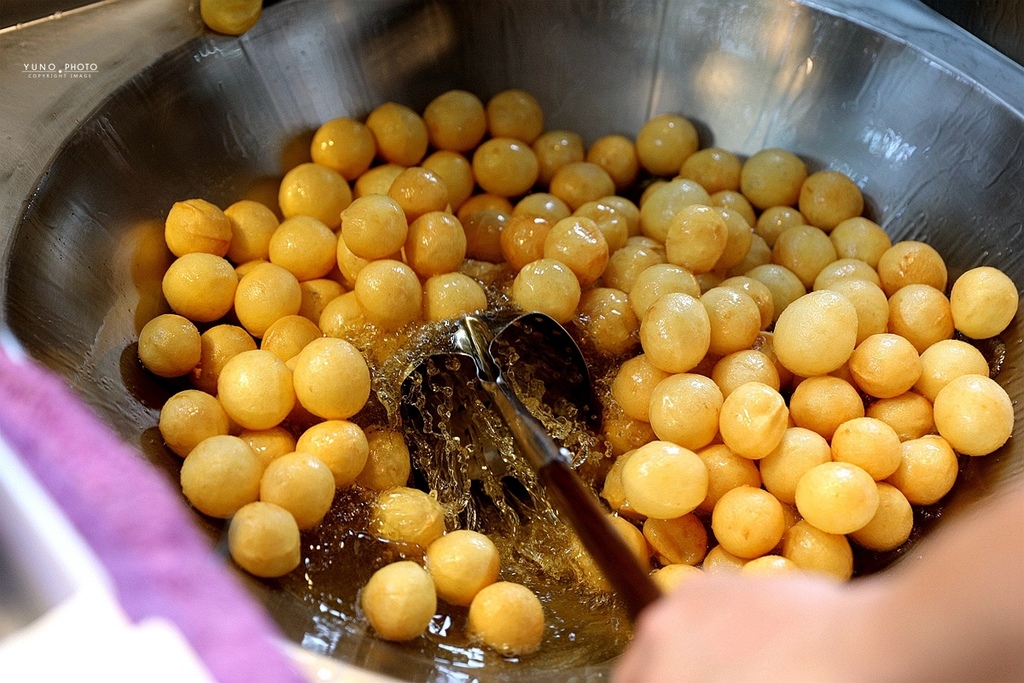 來來來 看看這黃澄澄的地瓜球 是不是很像一整鍋乒乓球呢