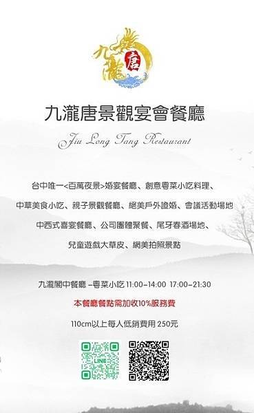 九瀧唐景觀宴會餐廳營業時間:11:00–14:00, 17:00–21:00 周一公休