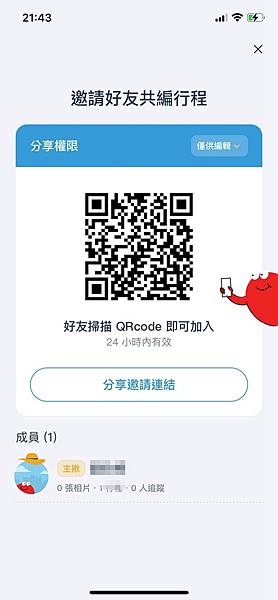 也能邀請朋友共同編輯行程 只要掃QR code就能跟你一起共編旅遊景點