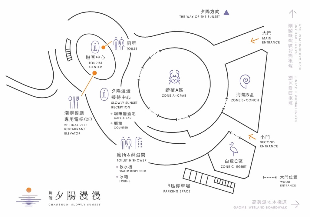 會先看到夕陽漫漫招牌,繼續直走會看到B區停車場標示,右轉抵達停車場後,請來電 0912-511-060 我們將為您引導至接待中心。