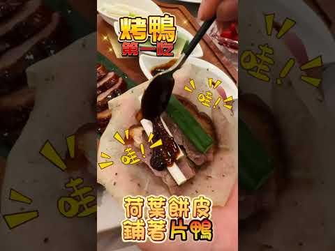 塞了滿滿片鴨及配料的烤鴨夾餅捲好送入口中 口感很有層次