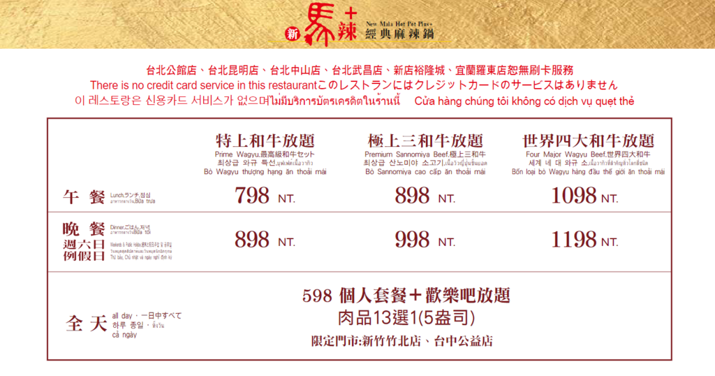 原文: 新馬辣經典麻辣鍋Plus+|和牛吃到飽$798起 即享啤酒/紅白酒無限暢飲 頂級肉盤、新鮮海鮮、哈根達斯無限量供應。菜單價位(台中西區公益路)