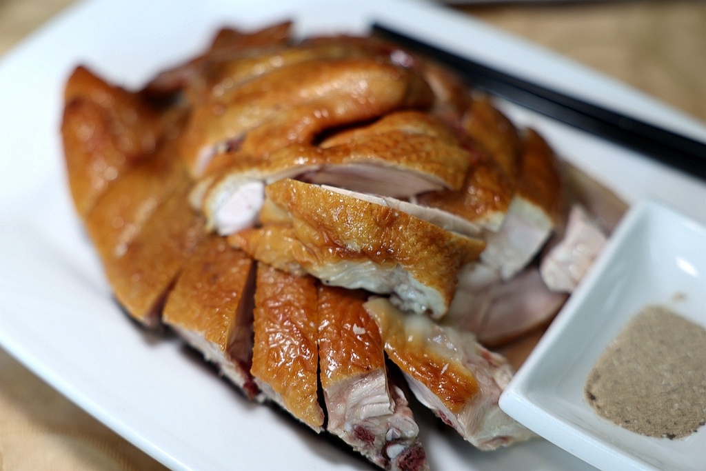 一上桌就讓人食指大動 選用放山雞 以甘蔗慢火燻製 煙香滲入雞皮與肉質之間 外皮金黃帶脆、油亮誘人